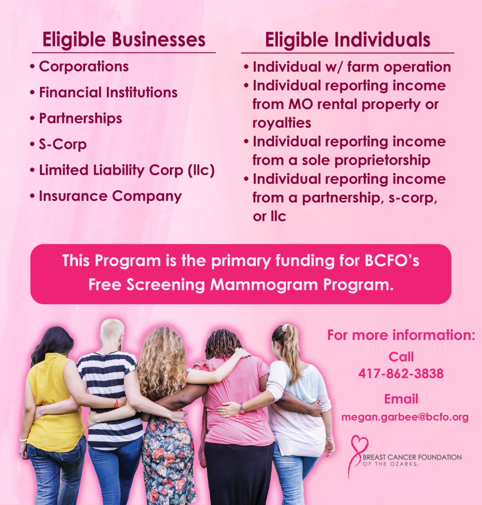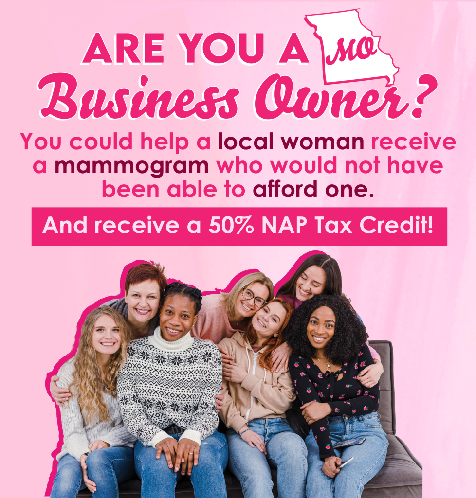 Breast Cancer Foundation of the Ozarks (BCFO) is approved to receive donations through Missouri’s Neighborhood Assistance Program (NAP). Through this program, donors with qualifying Missouri business income can receive a 50% Missouri state tax credit on qualifying gifts to BCFO — in addition to their usual charitable tax deductions. BCFO is allocated a set amount of NAP credits by the state, so credits are typically available on a first-come, first-served basis.